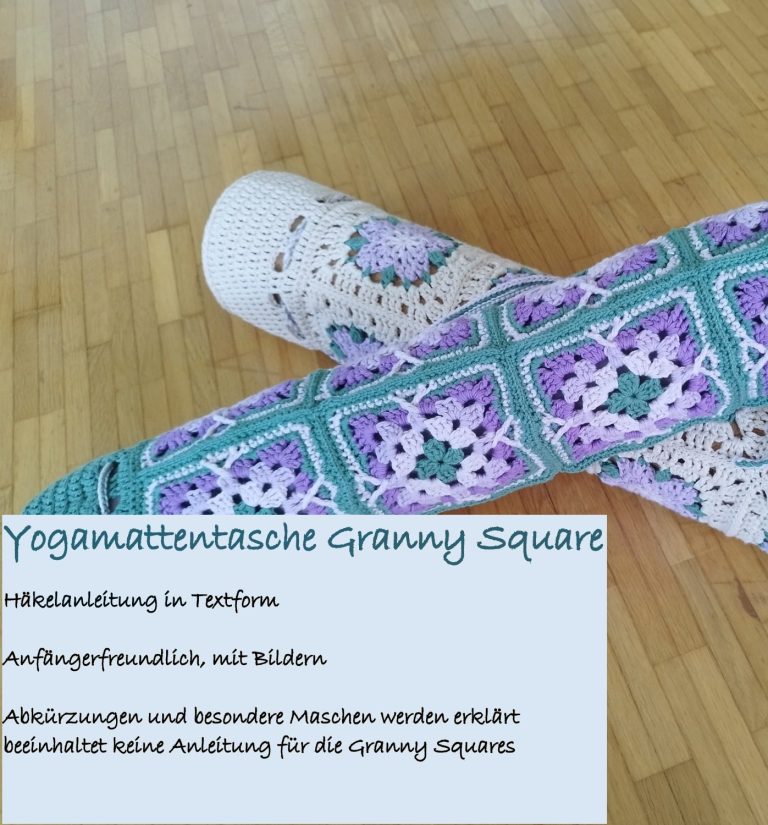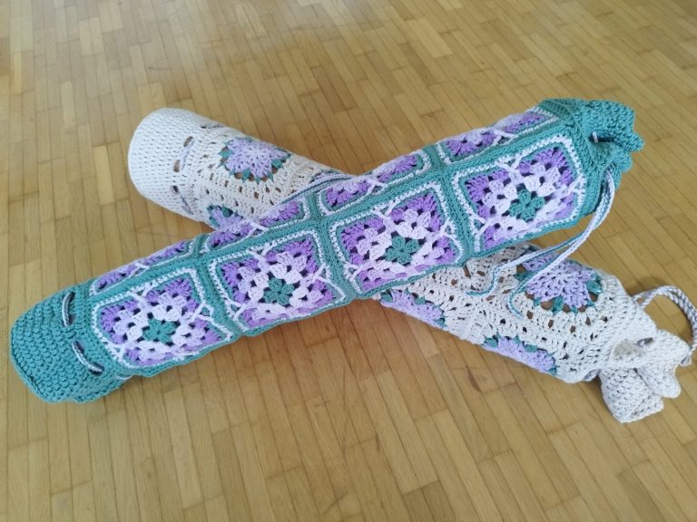 Tasche für Yoga- oder Sportmatten mit Standardmaßen und einer Dicke von bis zu 6mm. Gehäkelt aus 100% Baumwolle. Farben und verwendetes Granny Square können selbst gewählt werden.